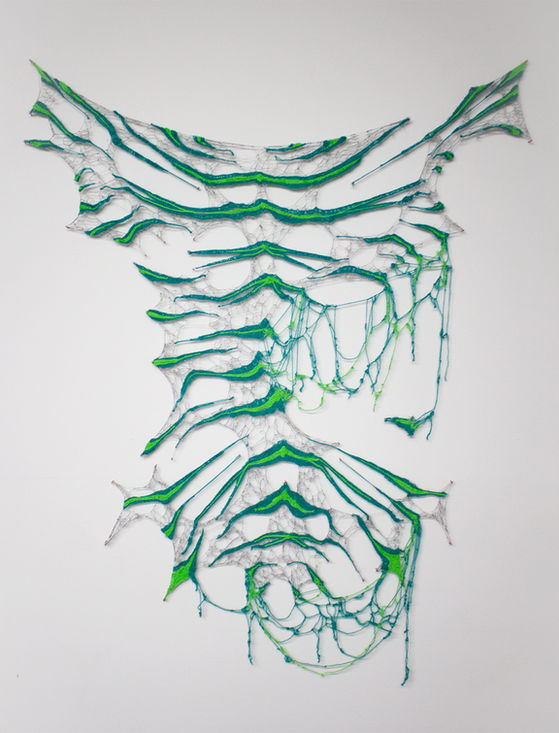 Unbacked chainstitch and darning embroidery, pink painted nails